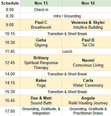 - Each modality session is presented by local experts. Please arrive a few minutes early to your session to get settled without interrupting the practitioner or other participants.